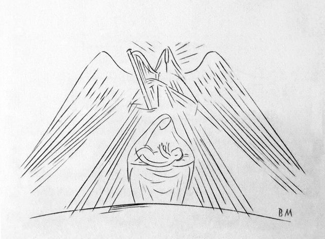 A karácsonyi ünnepkörben különösen is kifényesedik számomra ez a rajz. Az eredeti nyomat barna színű, mégis ragyog: olyan, mintha felülről ömlene lefelé a fény. Amikor rám talált ez a metszet, éppen kihunyóban voltak a fényeim, de amikor ránézek, eszembe juttatja az ismert éneket: „Halálban, éjben vártam én: fölkelt a nap rám véled. / Terólad ömlik rám a fény: a béke, boldog élet, / A Lélek ékességei; / Belőlük hitnek mennyei / Szép tisztasága árad.” (RÉ 21 412,3)