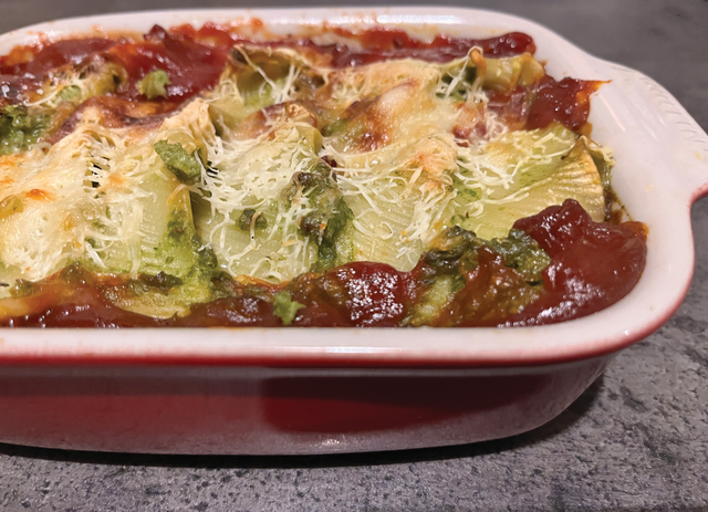Ezután sós vízben kifőzzük a kagylótésztát al dentére. Leszűrjük, hideg vízzel leöblítjük, és hagyjuk kihűlni. Kiválasztunk 25 ép darabot. A sütőt előmelegítjük 180 fokra. Egy 30×20 centis hőálló tál aljára eloszlatjuk a szósz nagyjából felét. A tésztákat megtöltjük egy-egy evőkanál töltelékkel, majd egymás mellé rendezzük őket a tálban, nyitott felükkel felfelé. A maradék szószt rákanalazzuk, majd megszórjuk reszelt sajttal. A tálat lefedjük alufóliával, és 30 percig sütjük. Ezután levesszük a fóliát, és addig sütjük, amíg a teteje enyhén megpirul és a szósz bugyogni kezd. Kivesszük a sütőből, 10 perc pihentetés után tálaljuk.